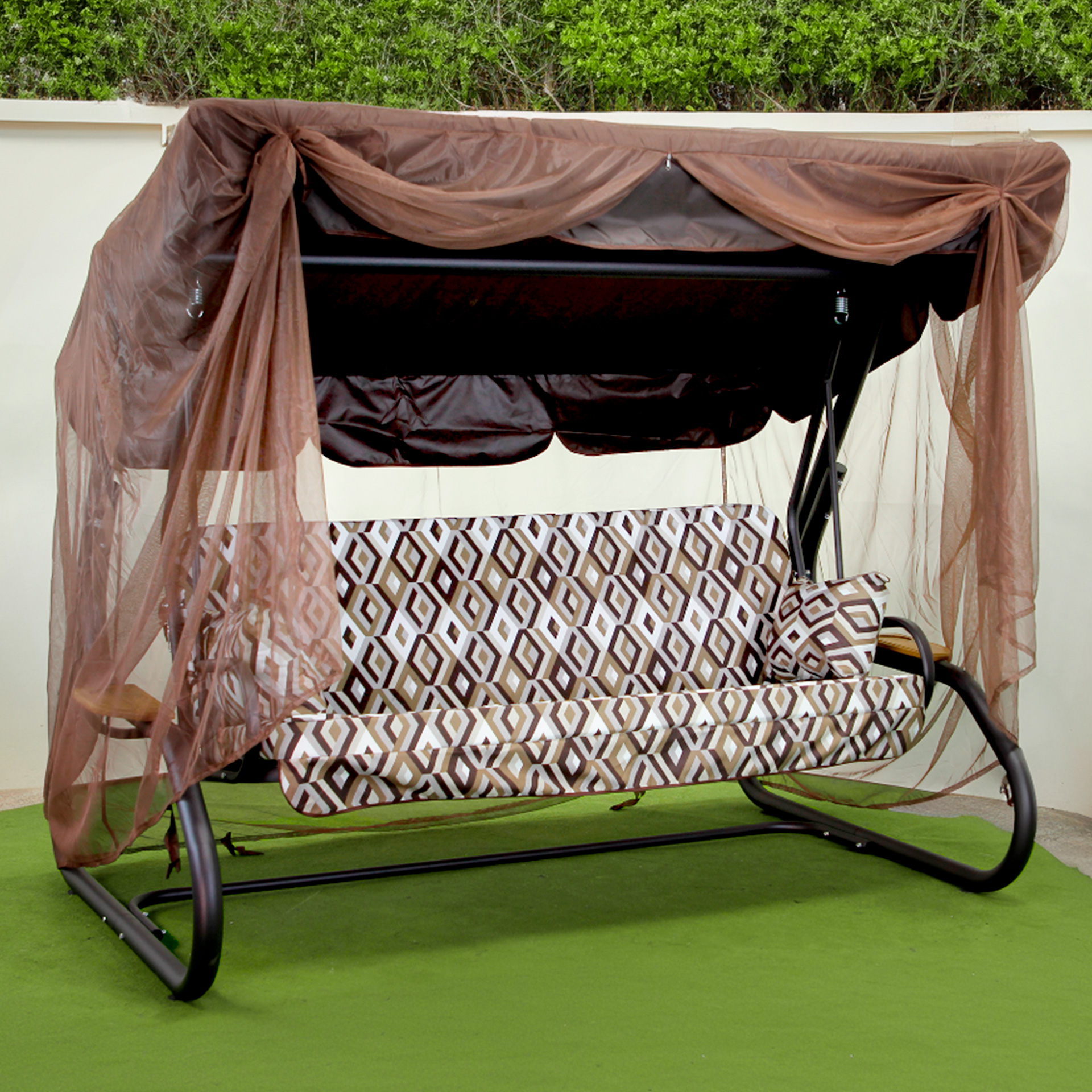 Цвет тента — практичный коричневый, гармонично вписывающийся в любой ландшафтный дизайн.