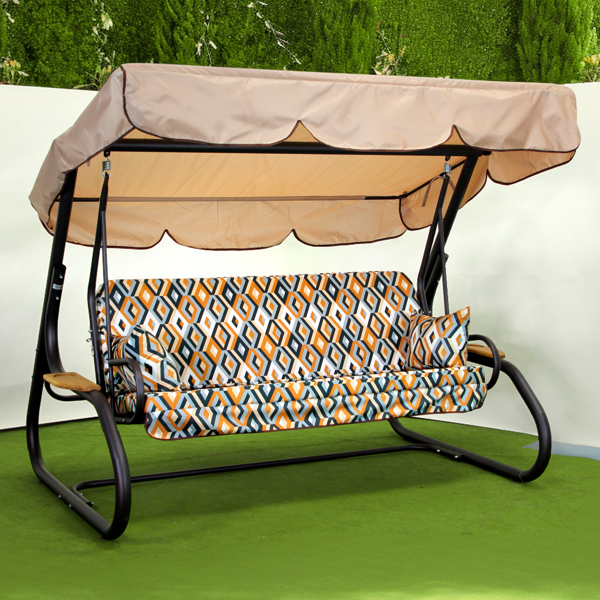 Сиденье трансформируется: в разложенном виде его размер составляет 1800×1150 мм, позволяя использовать качели как удобное место для отдыха лёжа, а в сложенном — 1800×555 мм. В качестве наполнителя используется плотный поролон толщиной 80 мм, обеспечивающий комфорт и хорошую поддержку. Чехлы из мебельного велюра приятны на ощупь и придают изделию более премиальный внешний вид.