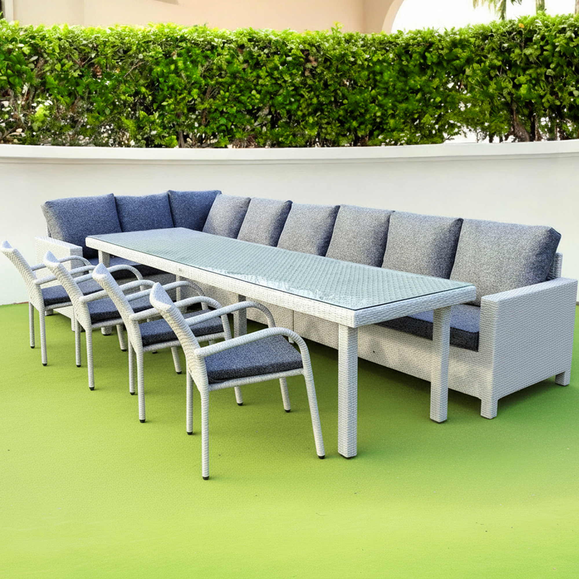 Каркас мебели отличается прочностью и устойчивостью, а плетение из искусственного ротанга обеспечивает долговечность и устойчивость к внешним воздействиям. Материал не выгорает на солнце, не боится влаги и перепадов температур, что делает комплект идеальным как для улицы, так и для помещения.